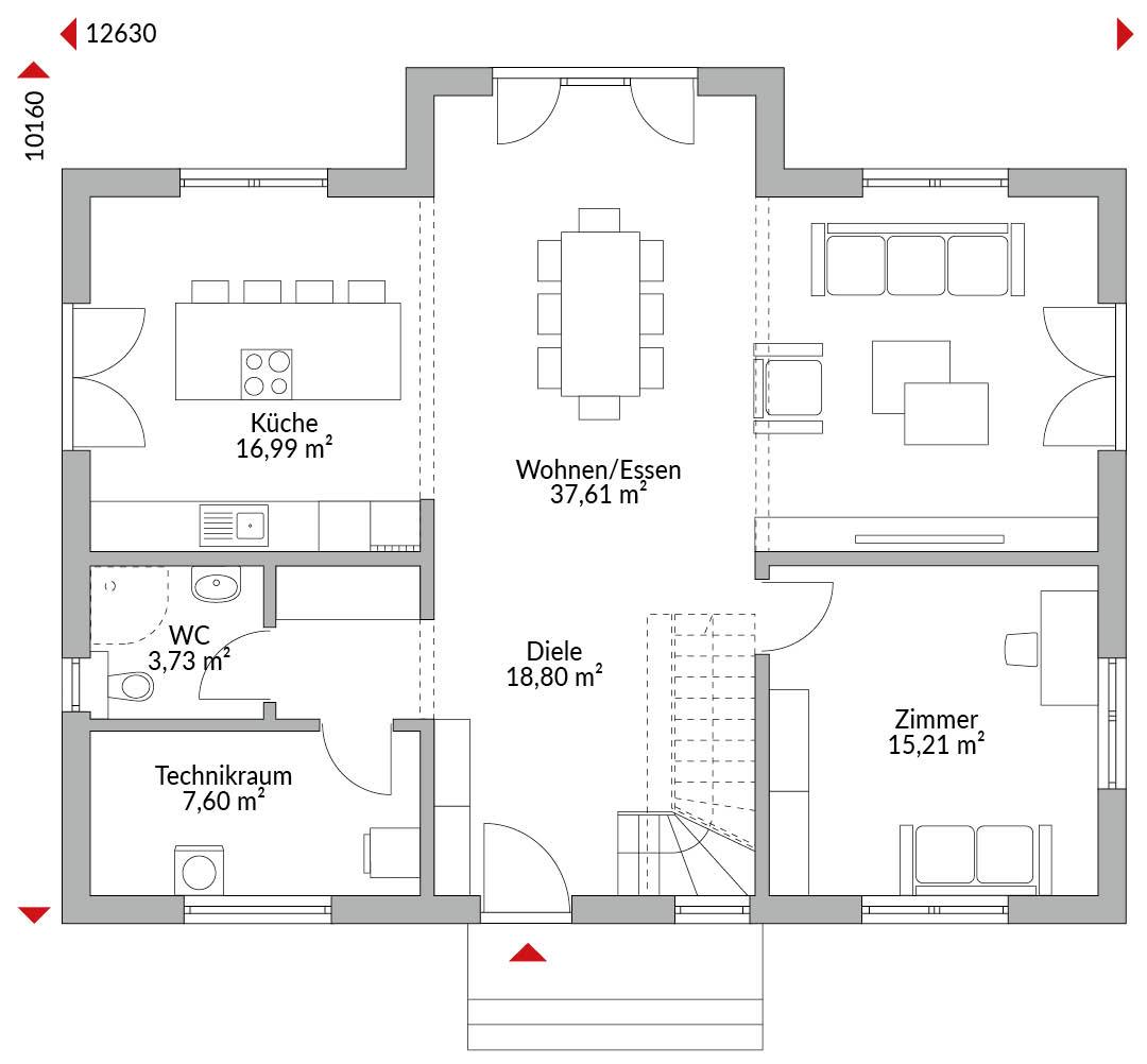 Zweigeschossiges Haus mit fünf Zimmern, offener Küche, geräumigem Wohn-/Essbereich, Gäste-WC, Technikraum und Diele, Bad und Ankleide im Obergeschoss, Walmdach mit 22° Dachneigung.