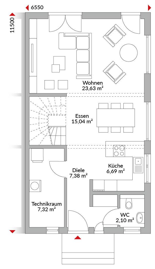 Eineinhalbgeschossige Doppelhaushälfte mit vier Zimmern, Ankleide, Küche, Bad, Gäste-WC, Technikraum, Abstellraum und Diele. Satteldach mit 40° Dachneigung, Kniestock 1,25 m. Abgeschlepptes Dach als Terrassenüberdachung.