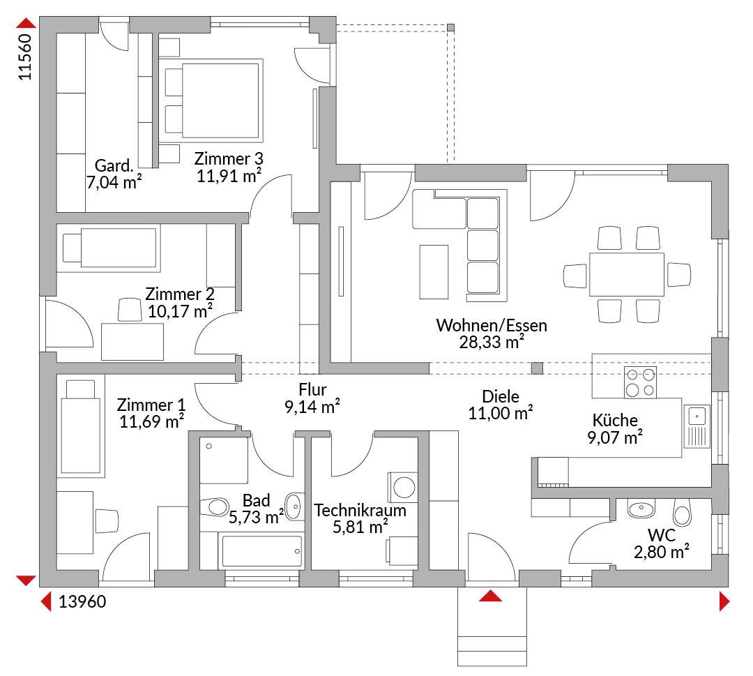 Bungalow mit 4 Zimmern, Ankleide, offener Küche, Bad, Gäste-WC, Technikraum und Diele. Satteldach mit 22° Dachneigung.