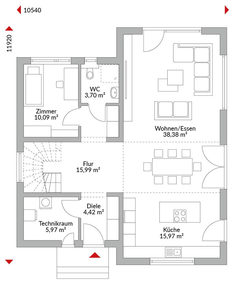 Bungalow mit drei Zimmern, offener Küche, Speisekammer, Bad, Gäste-WC, Diele und Technikraum. Essbereich offen bis unters Dach. Pultdach mit 25° Dachneigung.