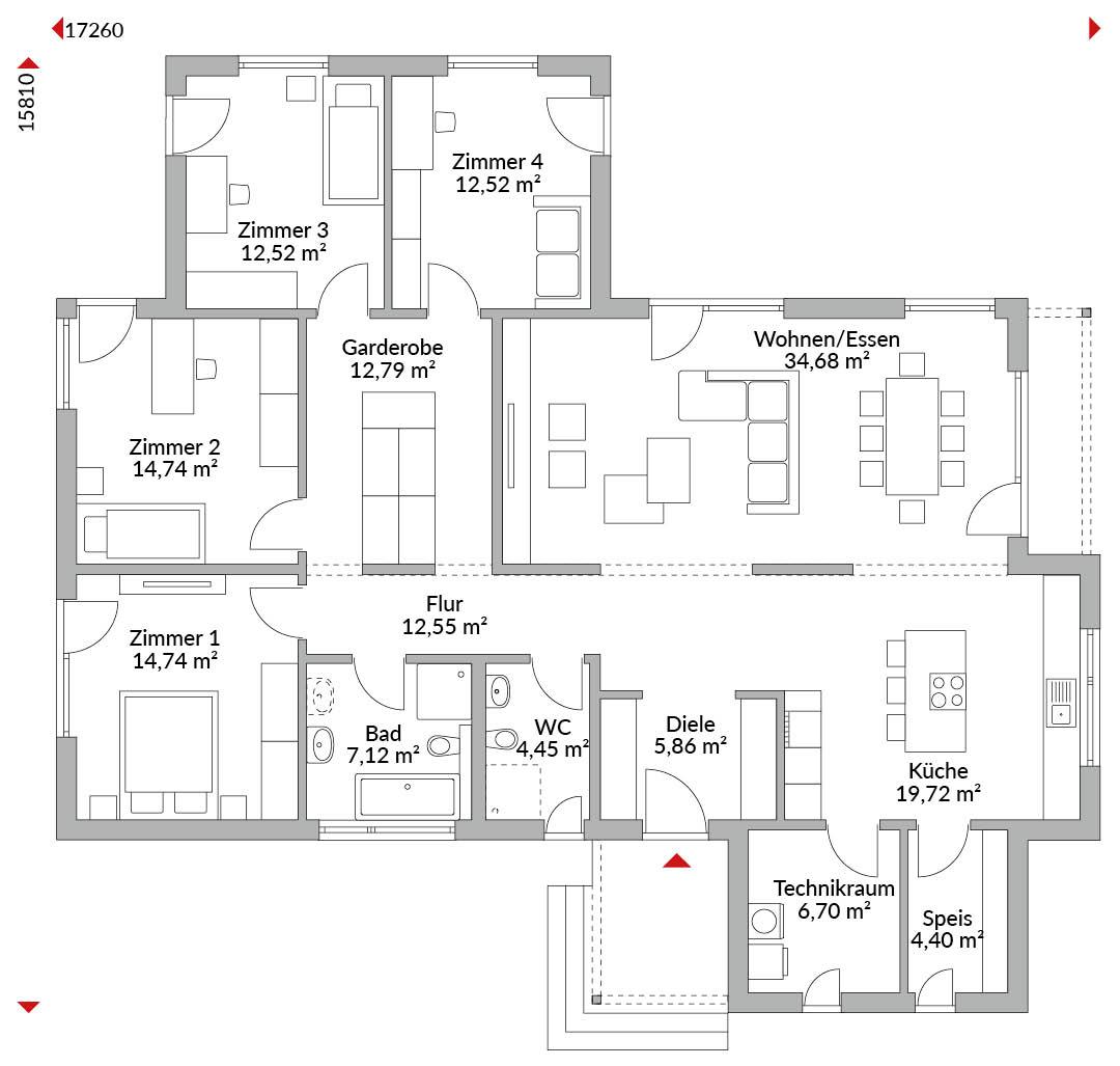 Winkelbungalow mit 5 Zimmern, offener Küche, Bad, Gäste-WC (Duschbad möglich), Diele, Flur, Garderobenraum und Technikraum. Walmdach (inklusive Haustürüberdachung) mit 25° Dachneigung.