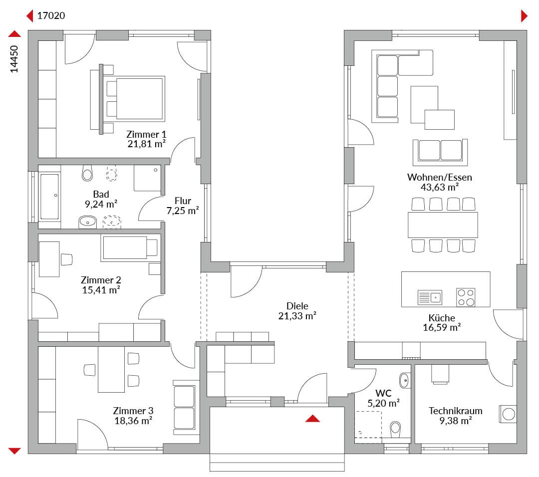 U-förmiger Bungalow mit vier Zimmern, Garderobe, offener Küche, Bad, Gäste-WC, Technikraum, Diele und Flur. Integrierte Eingangsüberdachung. Flachdach-/Pultdachkombination 0°/22° Dachneigung.