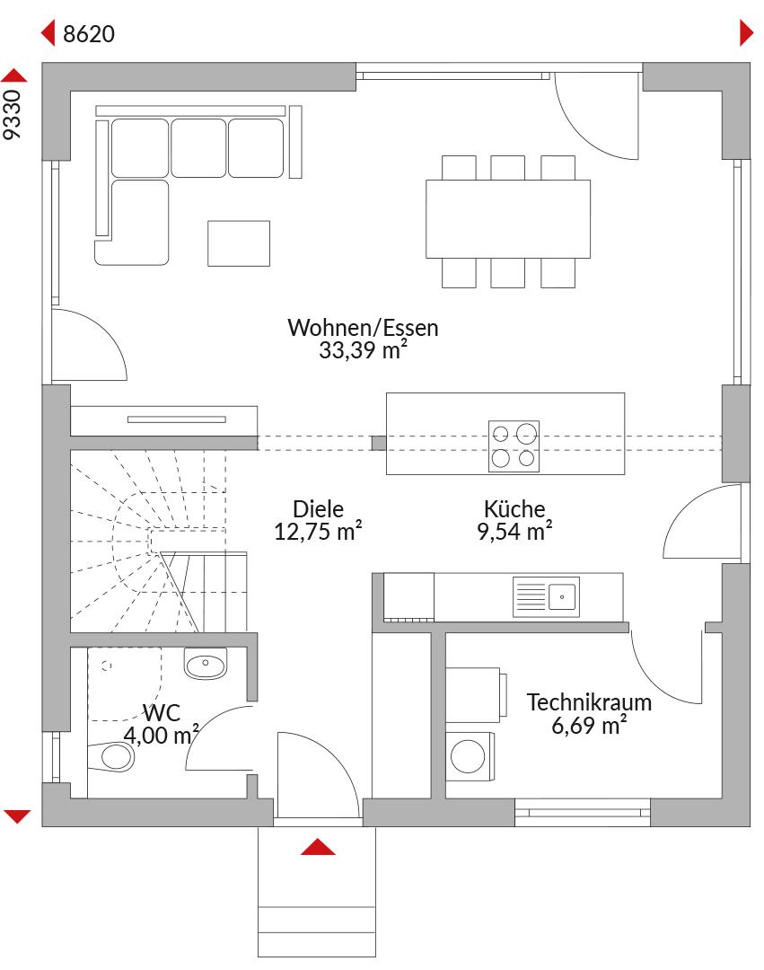 Eineinhalbgeschossiges Haus mit vier Zimmern, offener Küche, Bad, Gäste-WC, Technikraum und Diele, Satteldach mit 45° Dachneigung, Kniestock 0,75 m. Die Fassade ist im Standard weiß verputzt.