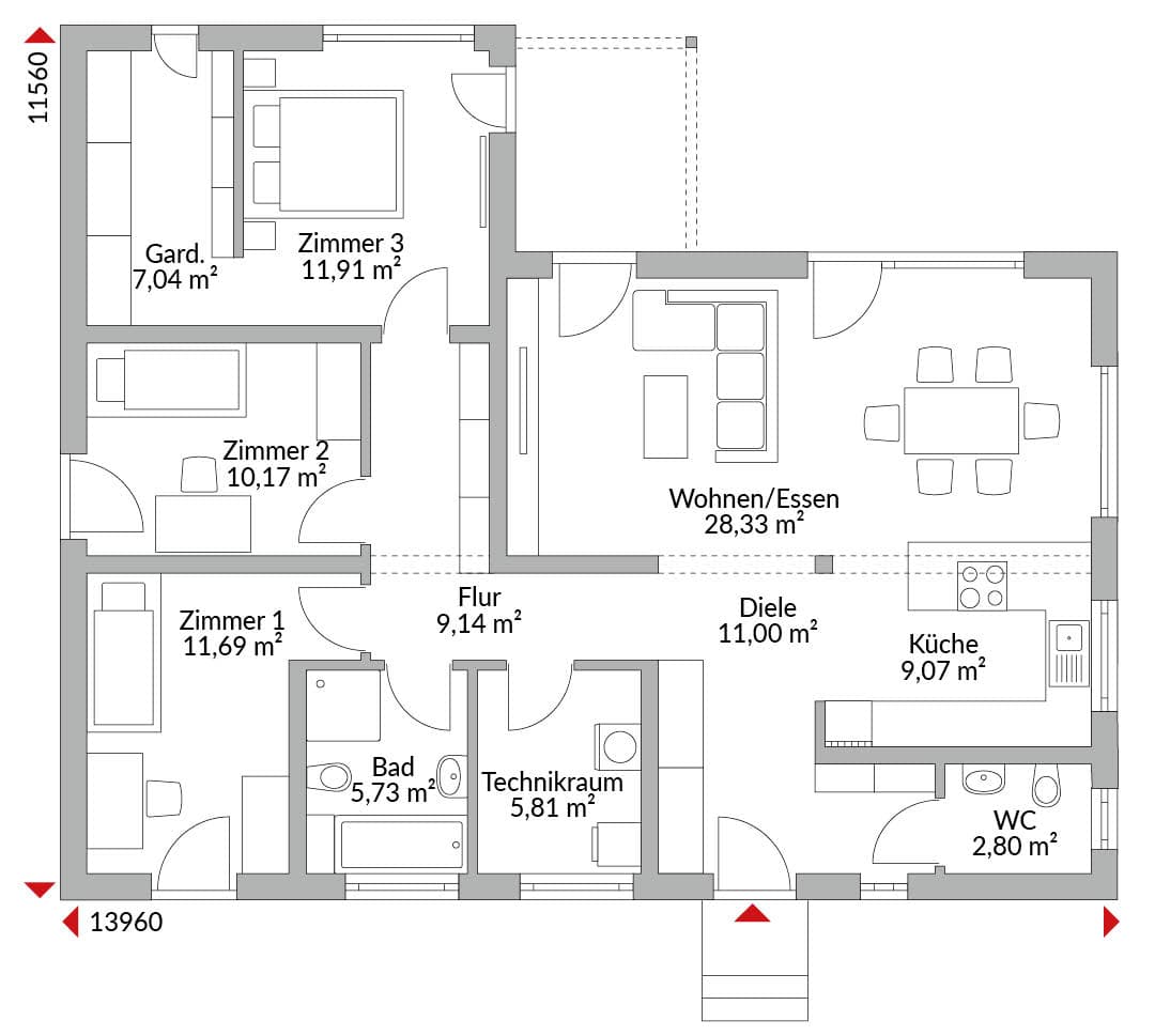 Bungalow mit 4 Zimmern, Ankleide, offener Küche, Bad, Gäste-WC, Technikraum und Diele. Satteldach mit 22° Dachneigung.