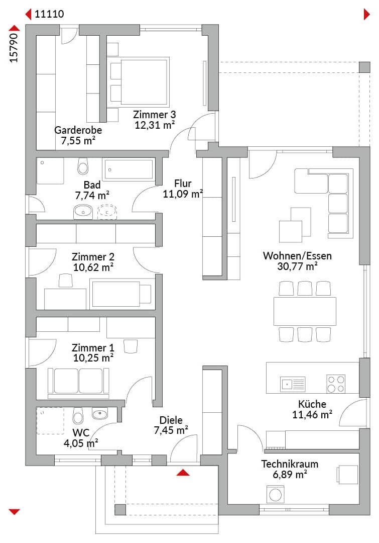 Winkelbungalow mit vier Zimmern, Ankleide, offener Küche, Bad, Gäste-WC (Duschbad möglich), Technikraum, Flur und Diele. Walmdach mit 25° Dachneigung inkl. Haustür-und Terrassenüberdachung.