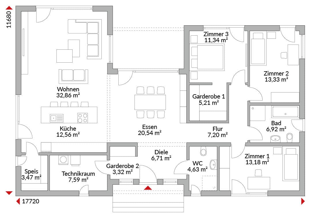 Bungalow mit vier Zimmern, Ankleide, Garderobe, offener Küche, Speisekammer, Bad, Gäste-WC, Technikraum, Diele und Flur. Integrierte Eingangs- und Terrassenüberdachung. Walmdach mit 25° Dachneigung.