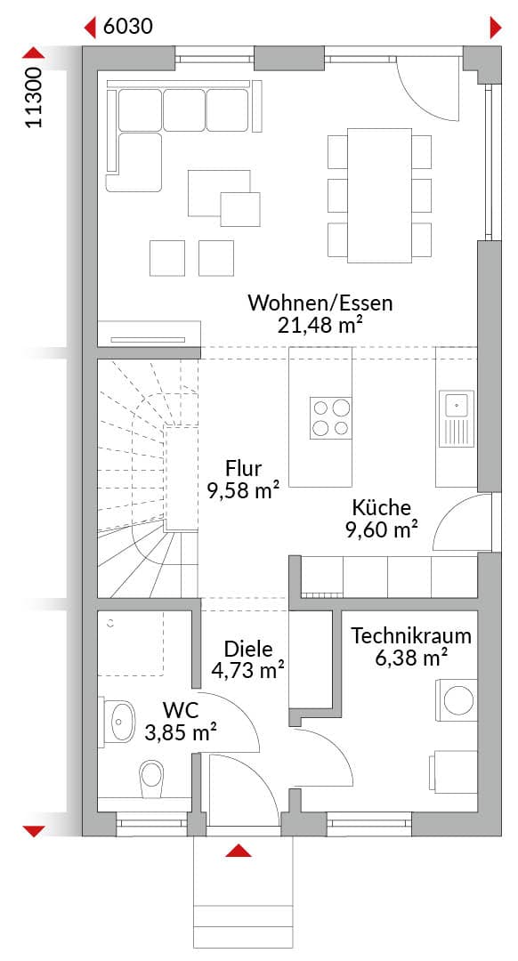 Eineinhalbgeschossige Doppelhaushälfte mit vier Zimmern, Ankleide, Küche, Bad, Gäste-WC, Technikraum und Diele. Satteldach mit 40° Dachneigung, Kniestock 1,25 m.