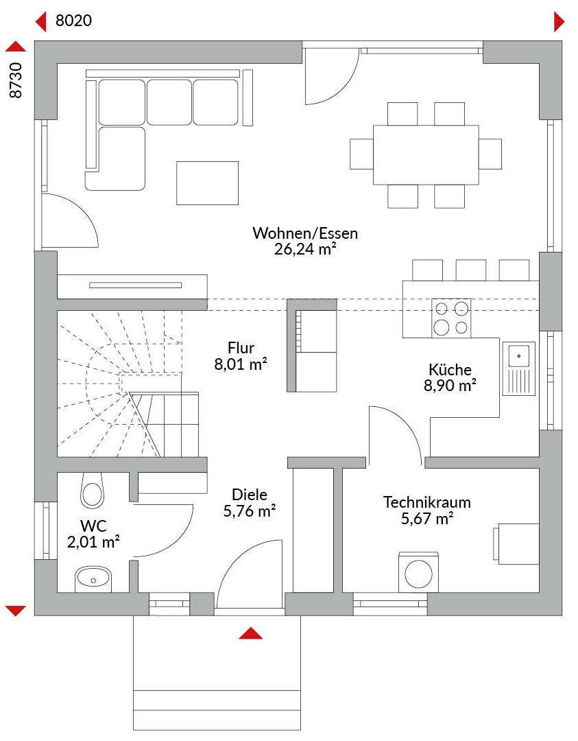 Eineinhalbgeschossiges Haus mit 4 Zimmern, offener Küche, Bad, Gäste-WC, Diele, Flur und Technikraum. Satteldach mit 40° Dachneigung. Kniestock 1,00 m.