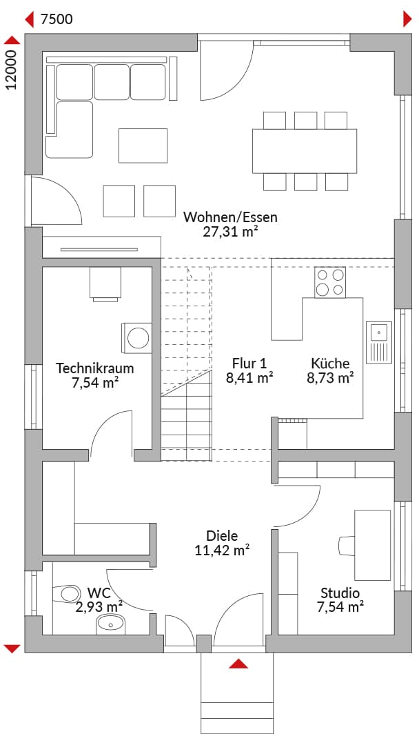 Eineinhalbgeschossiges Haus mit 4 Zimmern, Ankleide, Studio, offener Küche, 2 Bädern, Gäste-WC, Diele, Flur und Technikraum. Satteldach mit 30° Dachneigung. Kniestock 1,75 m.
