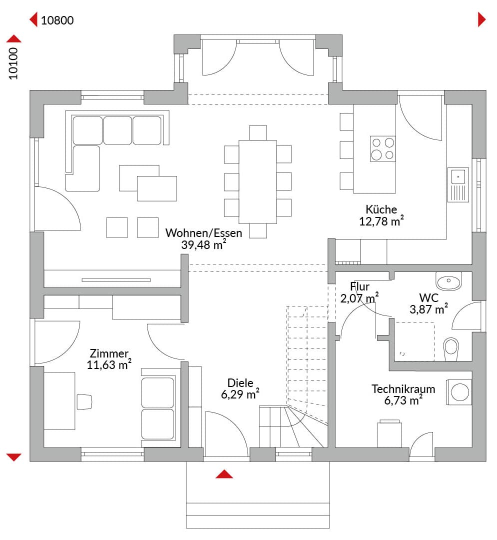 Eineinhalbgeschossiges Haus mit fünf Zimmern, einer Ankleide, offener Küche, Bad, Gäste-WC, Technikraum, Diele und Flur. Satteldach mit 35° Dachneigung, Kniestock 1,25 m. Inklusive Erker und Balkon.