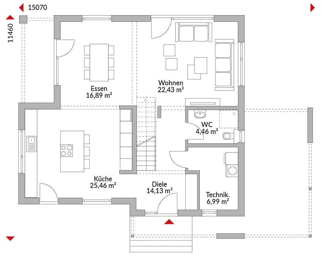 Eineinhalbgeschossiges Haus mit vier Zimmern, Ankleide, offener Küche, Bad, Gäste-WC, Technikraum, Diele sowie mit integriertem Carport mit Eingangsüberdachung und Terrassenüberdachung. Versetzte Pultdächer mit 25° Dachneigung, Kniestock 1,75 m und 1,424 m. Carport mit Flachdach.