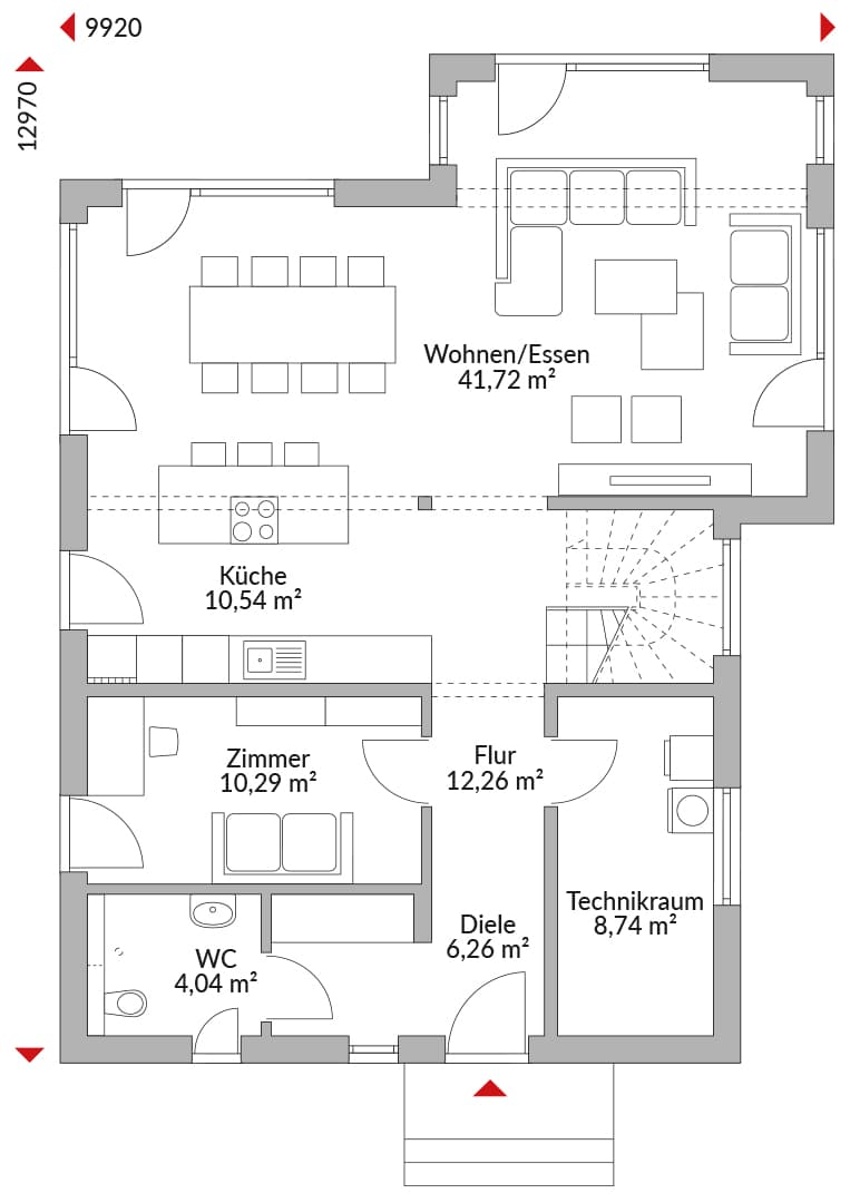 Eineinhalbgeschossiges Haus mit fünf Zimmern, einer Ankleide, offener Küche, Bad, Gäste-WC, Technikraum, Diele und Flur, Satteldach mit 35° Dachneigung, Kniestock 1,75 m.