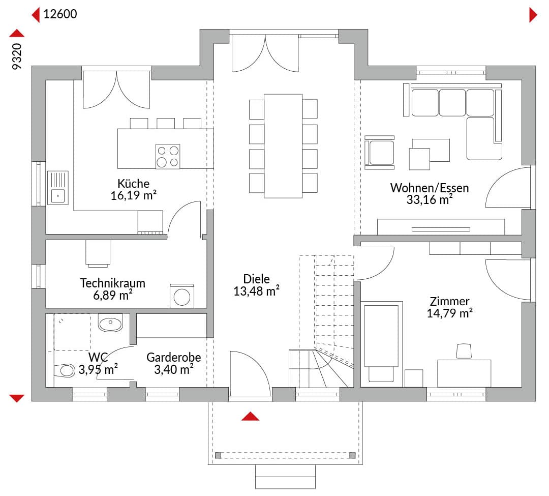 Eineinhalbgeschossiges Haus mit sechs Zimmern, offener Küche, Bad, Gäste-WC, Technikraum, Diele, Garderobe sowie zusätzlichem Zwerchgiebel. Satteldach mit 40° Dachneigung, Kniestock 1,00 m. Inklusive Zwerchgiebel, Balkon/Eingangsüberdchung.